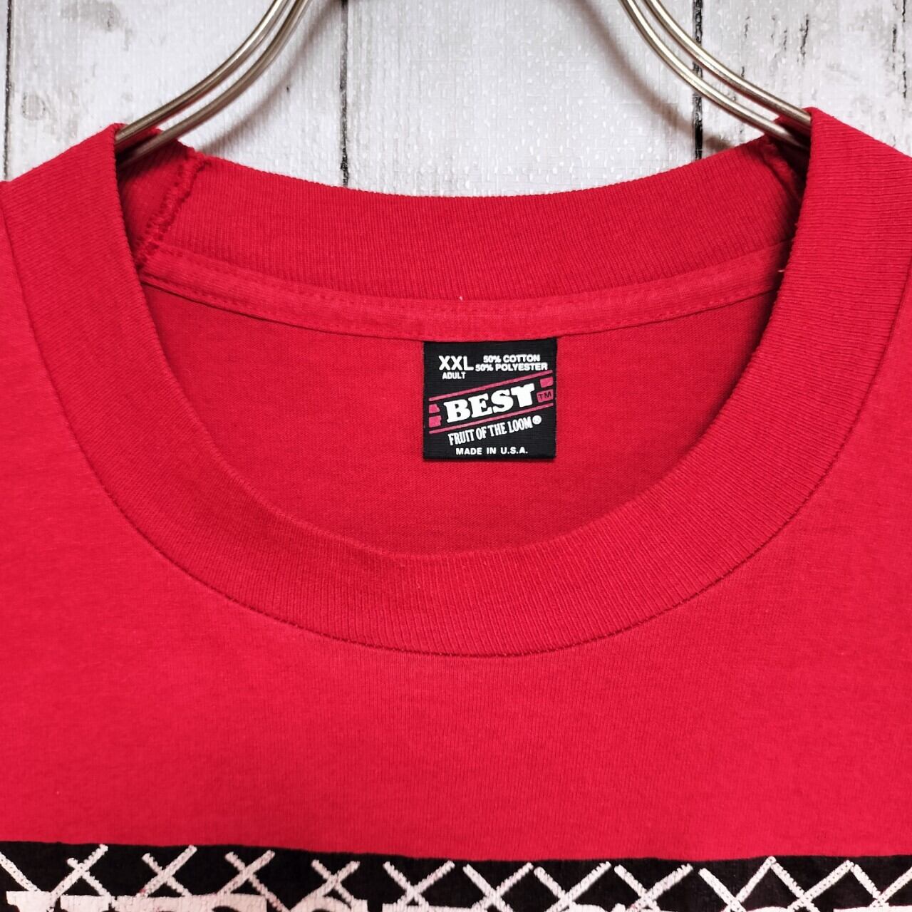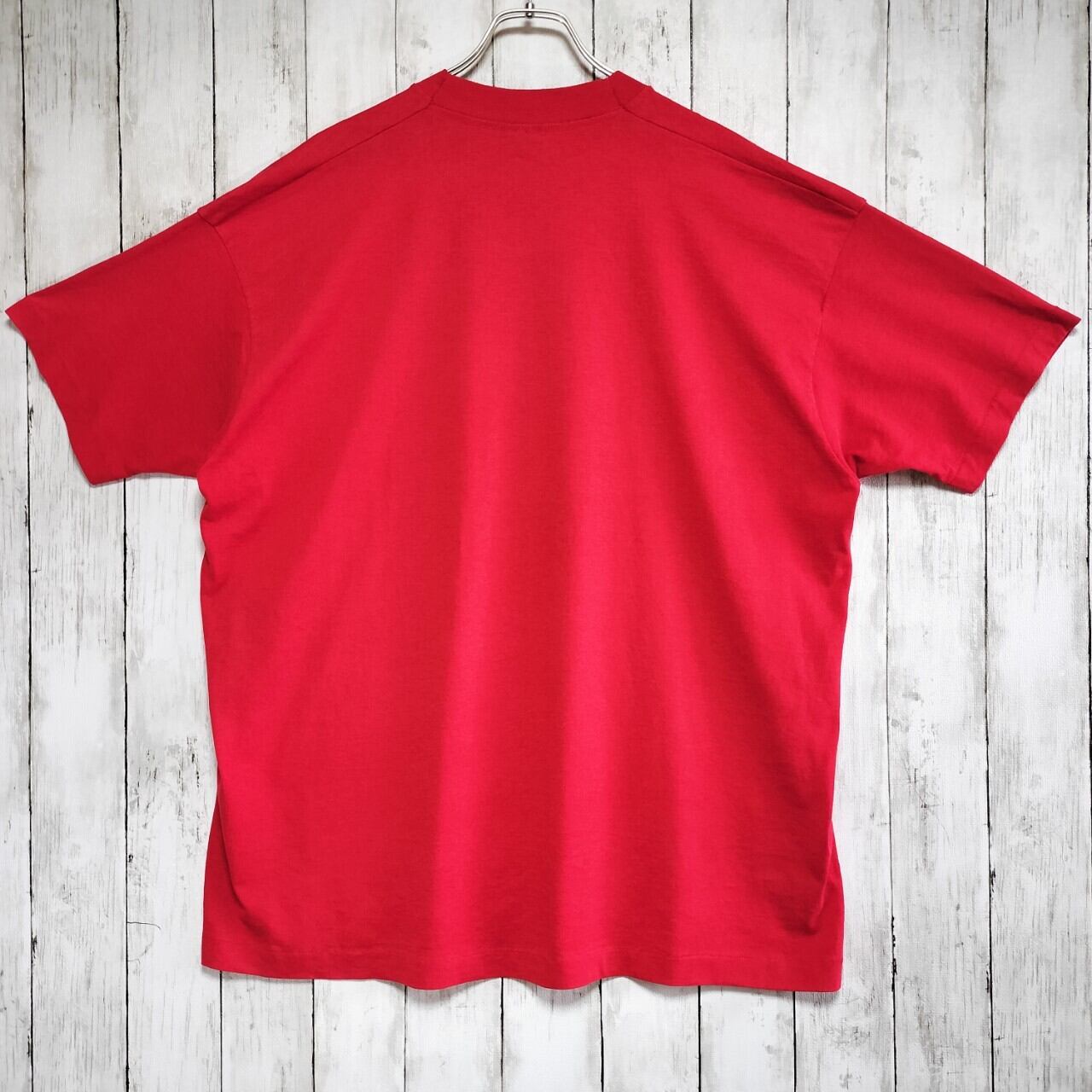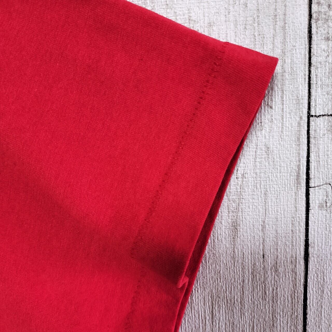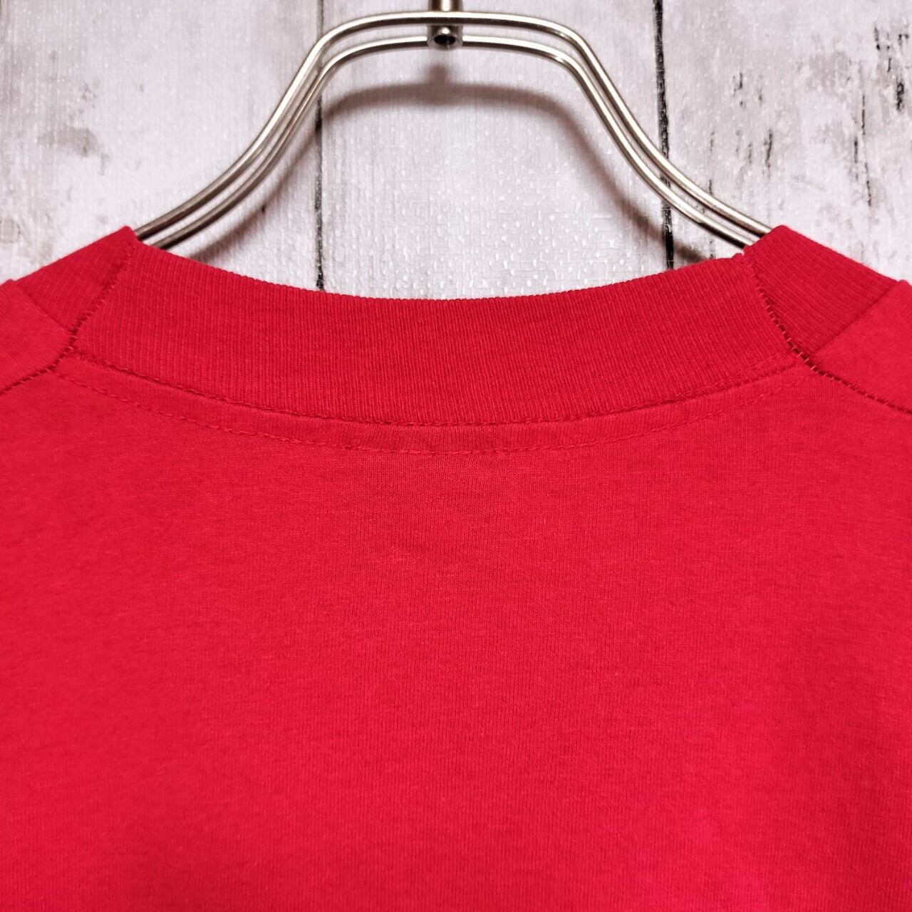 鮮やかな赤色が印象的で、レトロなシングルステッチが古着の魅力を引き立てます。