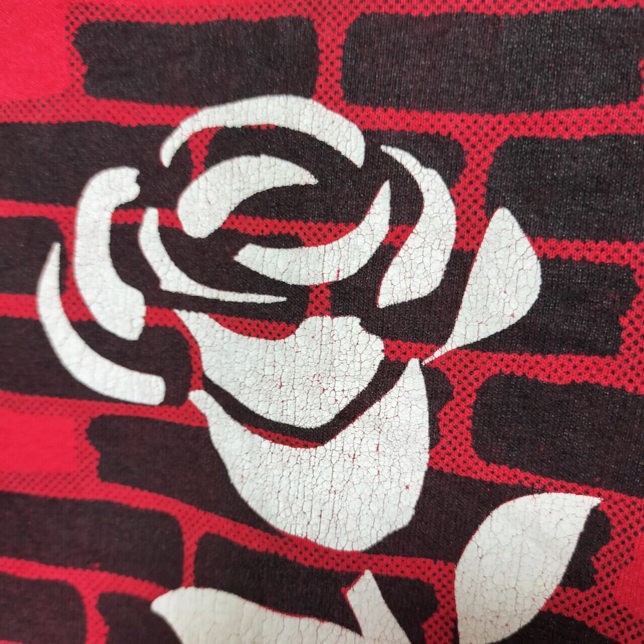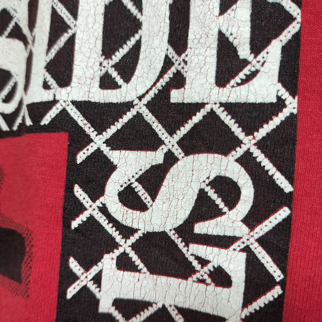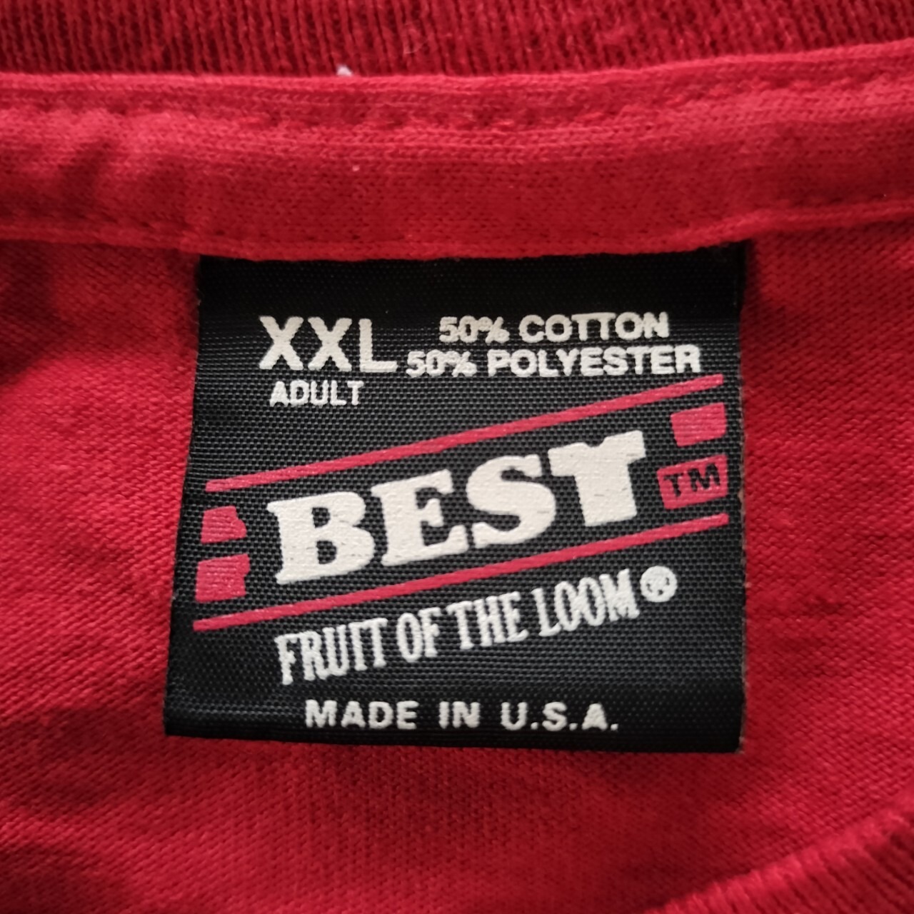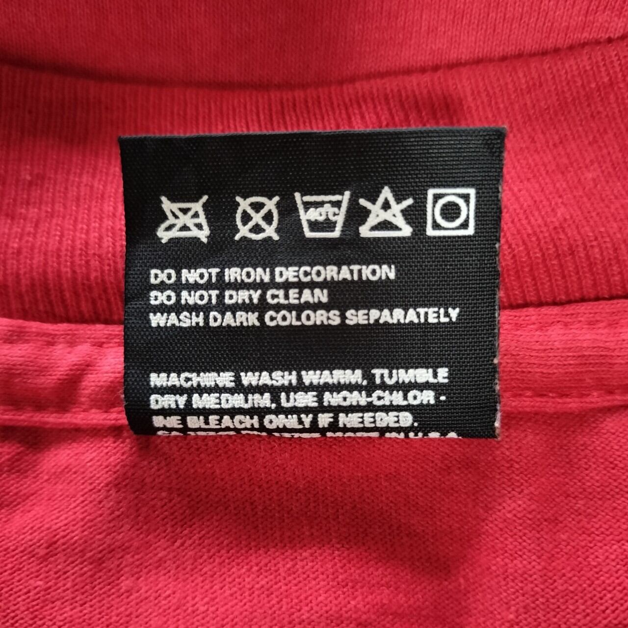 鮮やかな赤色が印象的で、レトロなシングルステッチが古着の魅力を引き立てます。