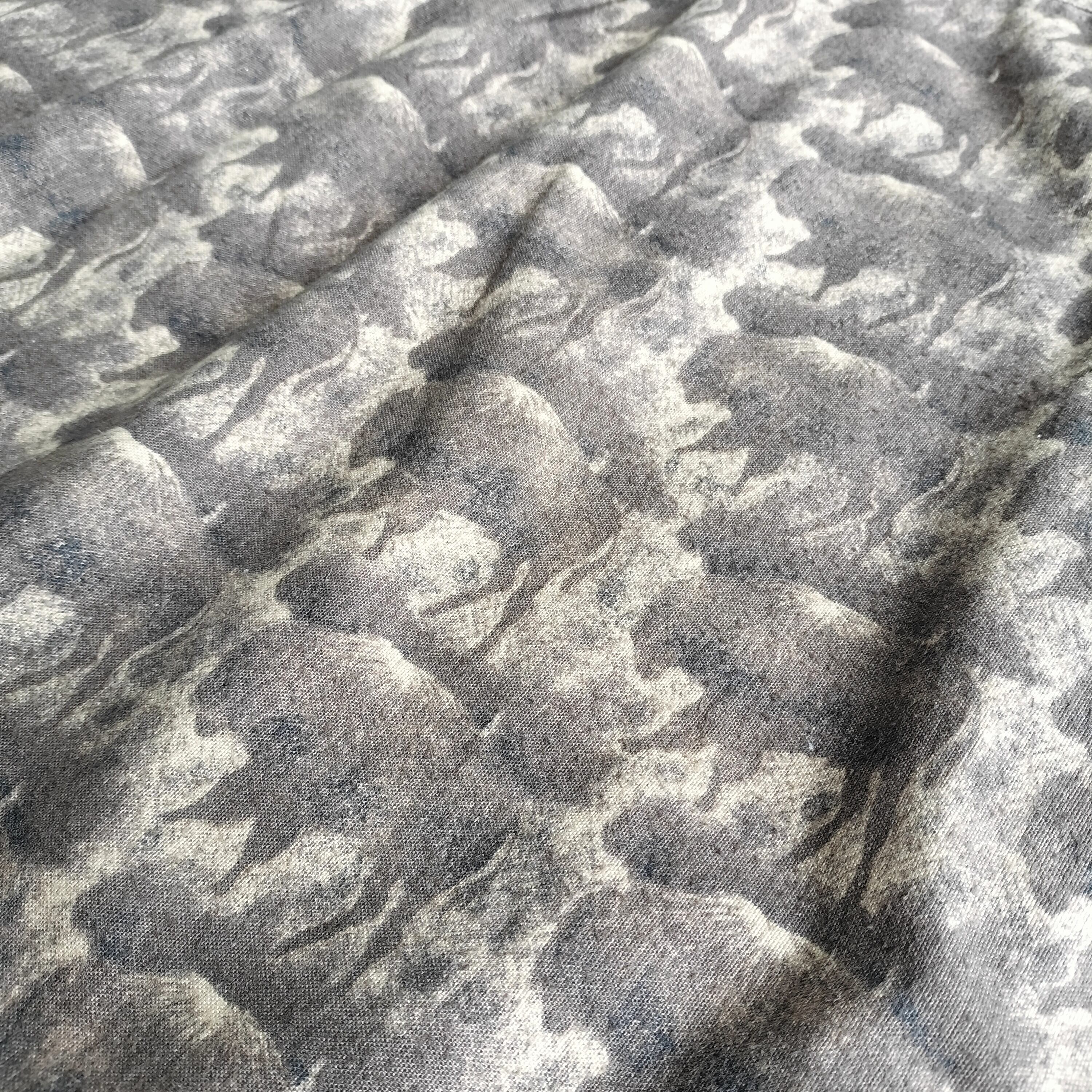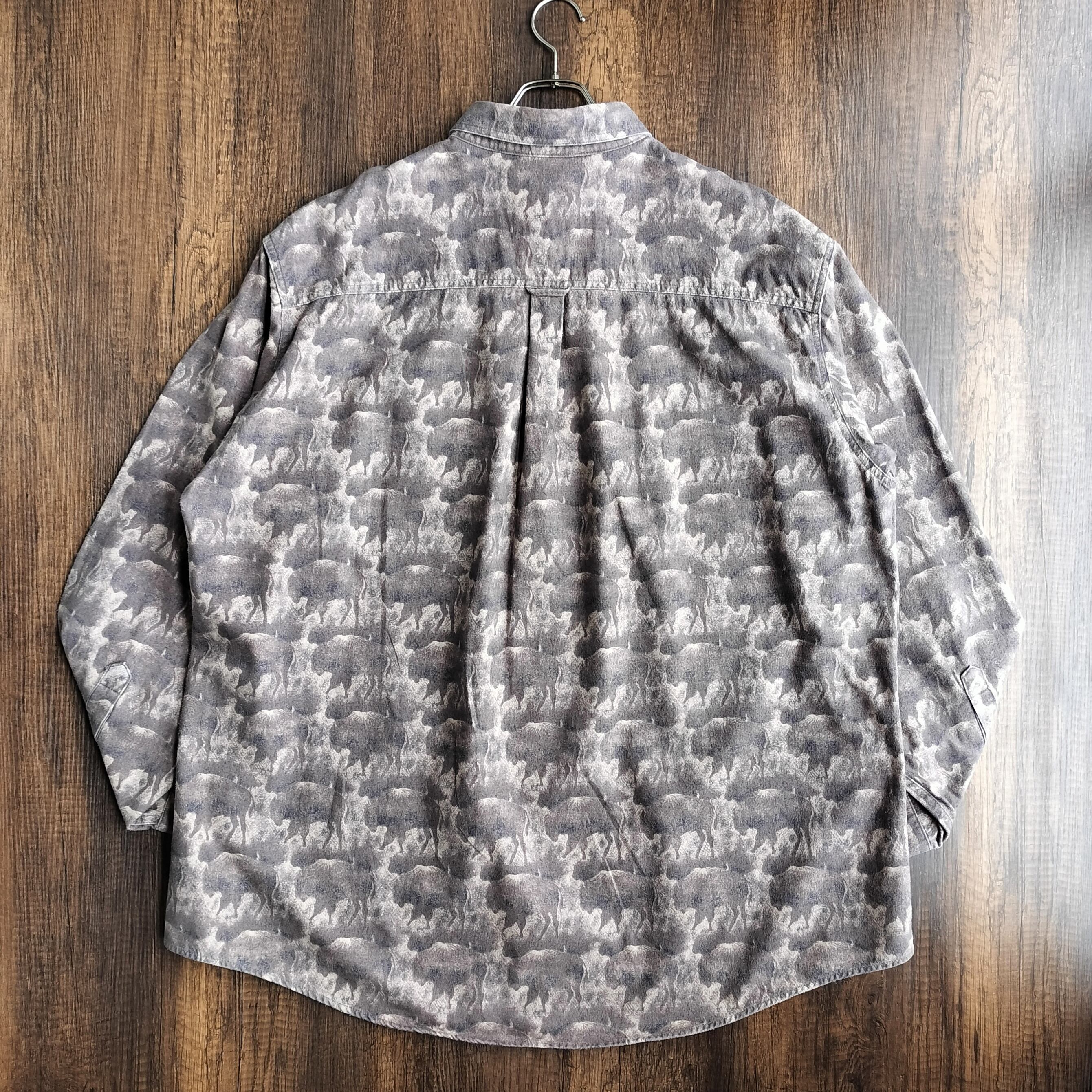 落ち着いたブラウンベースに、全面に入るバイソン柄が印象的な一枚。